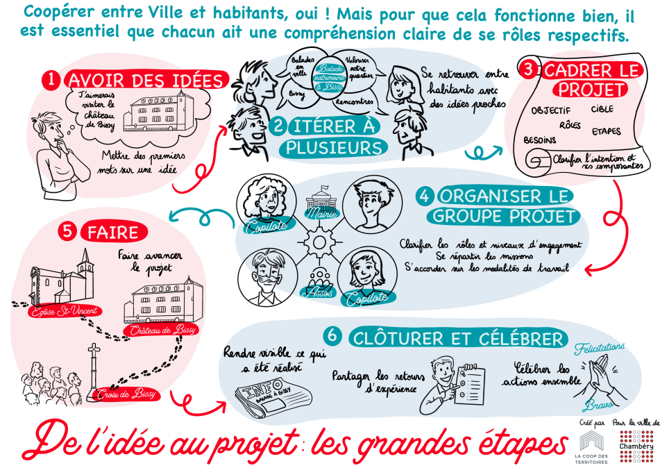 Pendant 6 mois, la Coop des Territoire a accompagné la Ville à définir un cadre et des méthodes à la gestion des projets issus d’initiative citoyenne, à la fois du côté des habitants (de l’idée ou la doléance à la proposition claire d’un projet) que des services de la Ville (accompagner le processus, pour faciliter la mise en oeuvre opérationnelle).